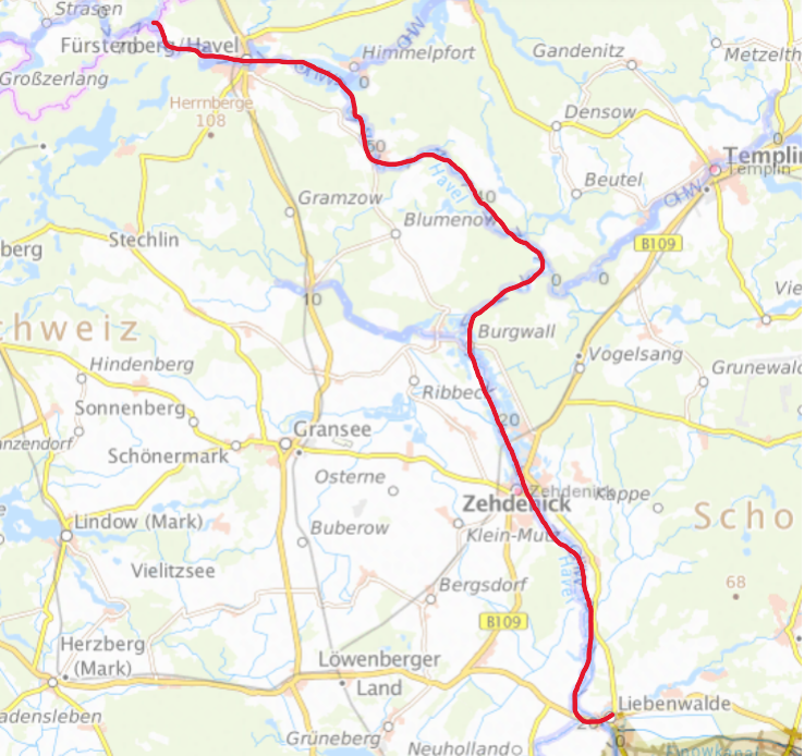 - Fahrtroute: Fürstenberg-Bredereiche-Regow-Zaaren-Schorfheide-Zehdenick-Bischofswerder-Anlegeplatz Liebenwalde