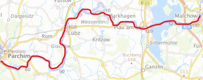 - Fahrtroute: Parchim-Neuburg-Lübz-Bobzin-Barkow-Plau am See-Malchow